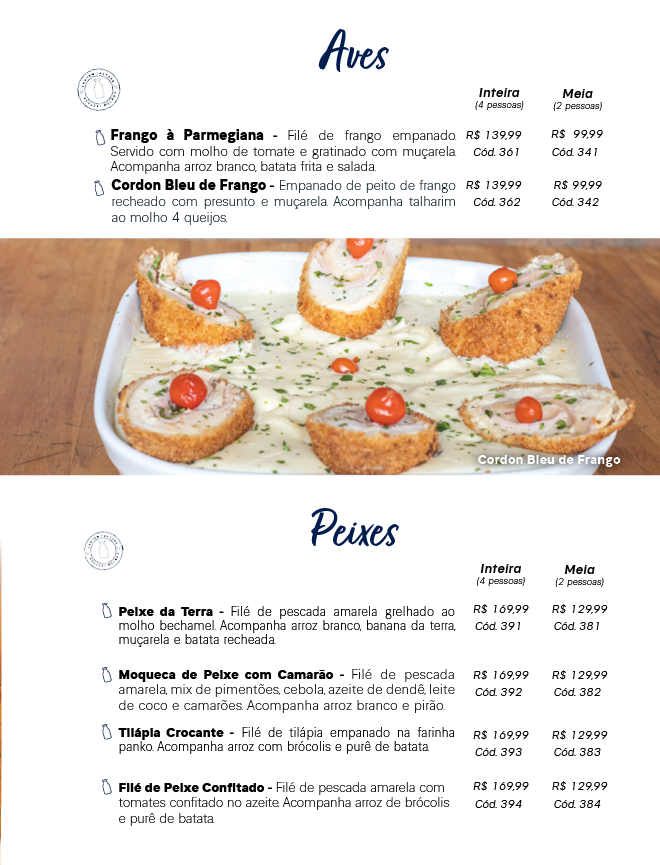 Empanado de peito de frango recheado com presunto e muçarela. Acompanha talharim ao molho 4 queijos.