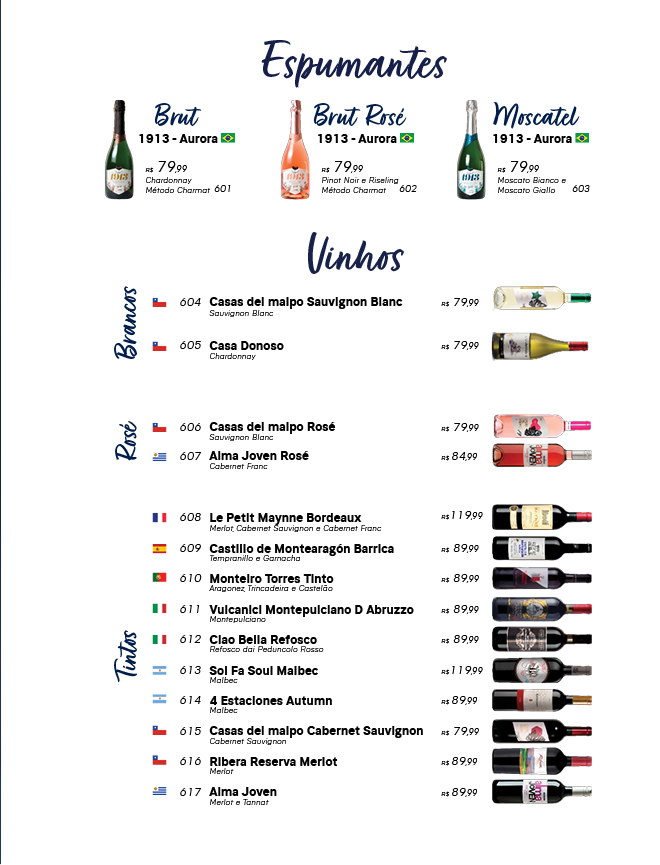 Espumantes: Brut, Brut Rosé e Moscatel Vinhos: Brancos, Rosé e Tintos